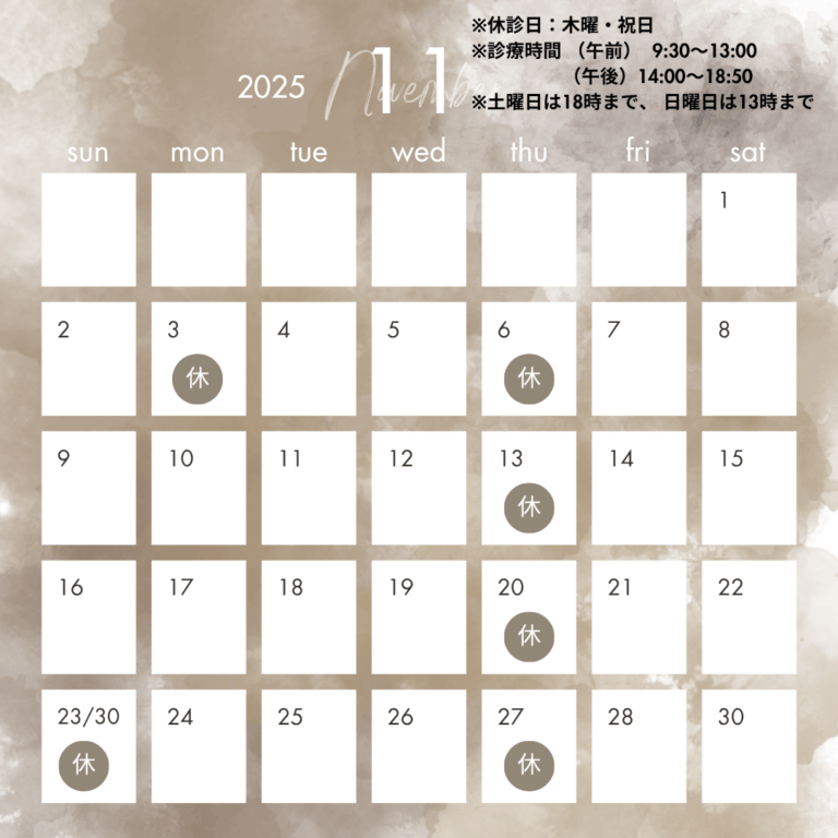 11月休診日のお知らせ 11月の休診日は 11/3(月・祝)・11/6(木)・11/13(木)・11 […]